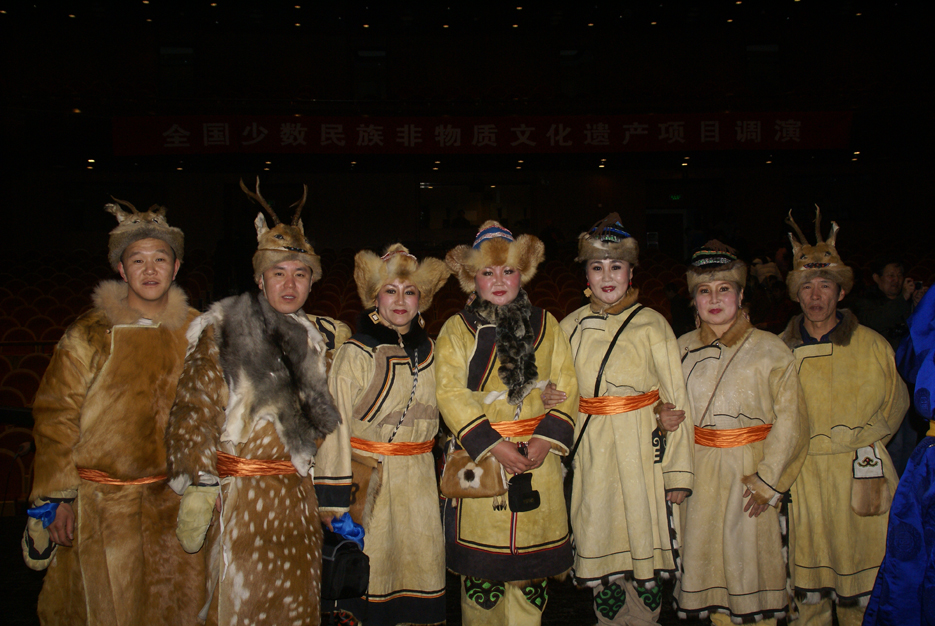 男子冬天戴“滅他哈”,漢語俗稱狍頭帽,將完整的狍子頭顱剔除骨肉,頂部不但完好地保留著雙耳雙角,還要在原來的眼眶處繡制出烏黑明亮的眼珠,下部鑲一圈皮毛,平時卷在上邊做帽沿,冷時放下來護住耳朵。夏天戴戴一種叫“巴里”的尖頂布帽,后帽檐垂至背部,既遮擋陽光又防止蚊蟲叮咬。婦女冬季戴氈帽。鄂倫春族不養羊,也不懂搟氈技術,從達斡爾人那里交換得來氈帽以后,進行再加工,就變成具有自己民族特色的帽子了。她們把氈帽前后沿和左右耳的里面鑲猞猁等珍貴皮毛,外面繡精美的花邊圖案,冒頂墜彩穗。平時前后沿和左右耳都向上翻卷,將漂亮的皮毛露在外面,冷時將左右耳放下,保暖且別有韻味。夏天戴“奇哈屯”,這是一種環形頭飾,用布或薄皮縫制一個頭箍,上面繡各種花紋,再鑲嵌貝殼、魚骨、獸齒或彩色紐扣。左右兩側綴3至5串彩珠,垂至下頜,既美觀又防止長發散亂。老年婦女一般只用一塊布或毛巾扎住額頭,用來束住頭發,也可以免受風寒。