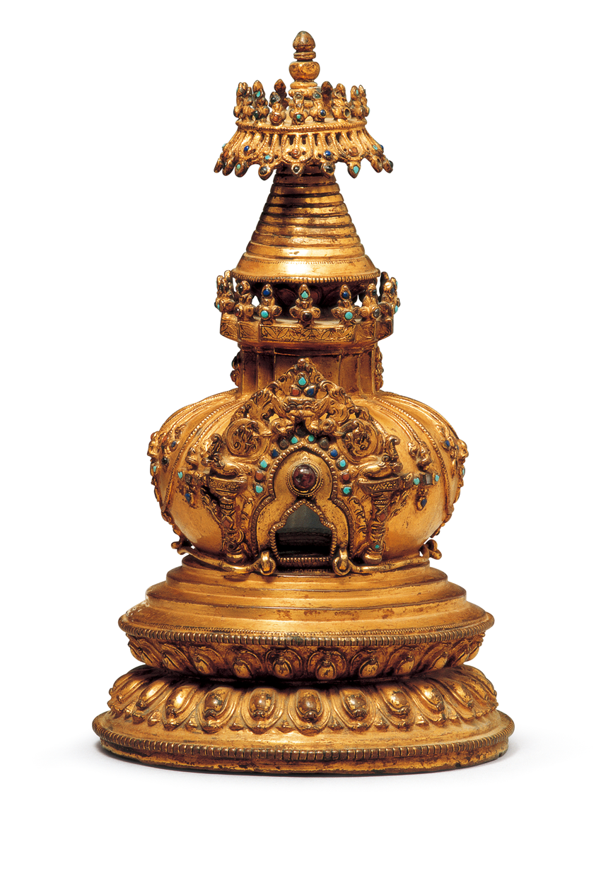 青海一些牧區,天葬日凌晨,死者最小的兒子將尸體抱出帳蓬,人們把已經捆好的尸體和一個裝滿土石的口袋連接起來搭在牛背上,或由天葬師背尸體到火葬場,送葬者不能回頭、不能喧嘩、不能停步。到天葬臺后,除留一個非親屬的老人外,其余人全部撤離,然后天葬師將尸體肢解喂禿鷲。如果禿鷲將碎尸吃干凈,意味著死者生前行善積德,其靈魂已升天,如果禿鷲沒吃干凈,說明死者生前有罪孽,家人要給寺院布施,請求寺院僧人再做法事,以贖死者罪惡,讓靈魂早日升天(圖為鎏金紫銅舍得塔)。