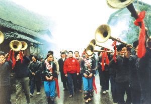 苗族姑娘們,穿鑲花邊衣褲,圍繡花抹裙,扎花絲頭巾,配銀飾花帶,可真叫艷麗。我們這些遠道而來的游客受到熱烈的迎接,姑娘們用古樸的攔門對歌為我們洗塵。攔門地點是在村頭的小橋邊,姑娘們拉著一排民族織錦帶,滿面春風地等待客人,兩邊苗鼓、獅子、嗩吶、甲馬長號夾道歡迎。儀式按苗族風俗,由苗族姑娘們先唱熱情的迎客苗歌,再請客人唱歌作客,對歌三次方過攔門第一關。緊接著她們又捧出大碗苞谷酒向客人們一一敬酒。熱情好客的姑娘們一定要待客人喝了香醇的美酒后,才示攔門結束。然后,又一路鞭炮,一路號角吹吹打打,把我們請進苗寨。