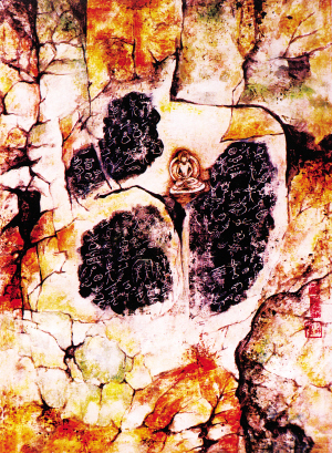 納西象形文在納西語中稱為“斯究魯究”,意思是“木石上的痕跡”或“木石上的記錄”。作品以殘缺不全、難窺全貌的東巴經卷和木牌畫上的各種原始形象和文字符號組成畫面,那些刻寫在木石上歷經千年的文化痕跡若隱若現。