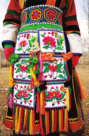 土族已婚婦女頭戴“扭達”(頭飾),身穿五色花袖衫,外套藍、黑色坎肩,勒花腰帶或褐帶,穿緋紅裙子,著繡花長腰布鞋;未婚姑娘則不戴“扭達”,不穿緋紅裙子,頭發不挽髻,只梳兩條小辮子,中間梳大辮子,三條辮子合辮成一條,用紅頭繩扎緊,上系兩枝小海螺;老年婦女只梳兩條辮子,辮梢系在一起,垂在背后,只戴卷邊氈帽,一般不戴“扭達”,不穿花袖衫,也不穿緋紅裙子,腰帶以黑布為多。
