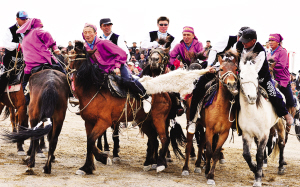 2014年5月2日,新疆克拉瑪依市在烏爾禾鄉舉辦了第三屆少數民族傳統體育運動會。在開幕式上,數萬名各族市民和農牧民觀看了克拉瑪依市千余名各族退休職工表演的大型健身操。300余名來自維吾爾族、哈薩克族、蒙古族等民族的運動員,參加了賽馬、叼羊、姑娘追、摔跤等活動。圖為叼羊比賽現場。