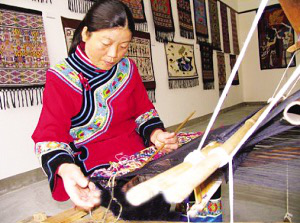 在鳳凰小城的晨曦中,東正街“水云”織錦坊里,貨架上幾乎看不到什么織錦物品,卻總有顧客慕名前來求購。“經(jīng)常是剛織好的織錦,一下織機就直接寄給了訂貨商。”說話的人就是葉水云,“土家織錦不用針,完全是用手挑出來的,所以出活特別慢,一天也就能織六七厘米,1米見方的一塊要織半個月。”在當?shù)兀芸棥拔魈m卡普”的女子已經(jīng)屈指可數(shù)。上世紀80年代中期,湘西大約有2000人從事土家織錦,現(xiàn)在大概還不足200人,招工很難。葉水云家的“活兒”被公認為做得最漂亮的,市場自然是供不應求,“水云織錦坊”早已名聲在外。