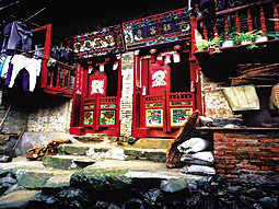 狹長式的房屋大都建在深山里幾十戶大小的村寨。面闊一間并開正門,室內隔間向縱深排列,從正門到后門有7道門之多。正門是大門也是第一道門,是家族的門面,被視為招財進寶和迎接貴客之門。對開門扇高大厚實,門檻上又設兩扇雕刻彩繪的矮門,天熱開大門通風時,可以防止禽畜入戶。大門兩側掛有木刻大字對聯,大門墻面的屋檐下則畫有七彩畫卷。