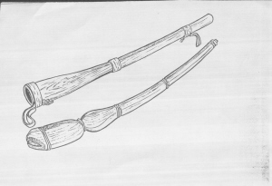 鄂倫春族獵手彪悍、好客,他們專門為我做了餅。這個餅可不同尋常,面是怎么和的呢?是在馬鞍上弄的,水是冰化成的。面和好后,放在火堆里烤熟,是真正的“燒餅”。用什么煮肉呢?用木頭支起一個大三腳架,架子頂上吊下來兩股繩,掛著鐵鍋。這種鐵吊鍋有雙耳,裝著木把手,與一般鍋不同的是,它的鍋耳不朝外而是朝內,木把手在鍋內上方,這樣再大的火也燒不著。我想到,在江西曾出土內耳陶鍋器,日本也有,可見這類器皿都是用來吊在篝火上燒水煮飯的。