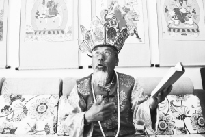 “東巴,在納西語里意為活佛或智者。”在玉龍納西族自治縣圖書館,李瑞山一邊講解,一邊向筆者展示館藏文物,這其中包括占卜紙牌畫、祭祀法杖和東巴經(jīng)等。引起筆者注意的是一幅形似唐卡的卷軸畫,畫中的主人公竟是藏族詩人倉央嘉措。“用東巴文所寫的《卓伯所》一書里,記載了納西族與藏族、白族先民之間同宗共祖的兄弟關(guān)系,這點(diǎn)與木氏宗譜碑上所刻是一致的。所以,我們有關(guān)于藏族的記載并不奇怪,民族交融自古就有。”