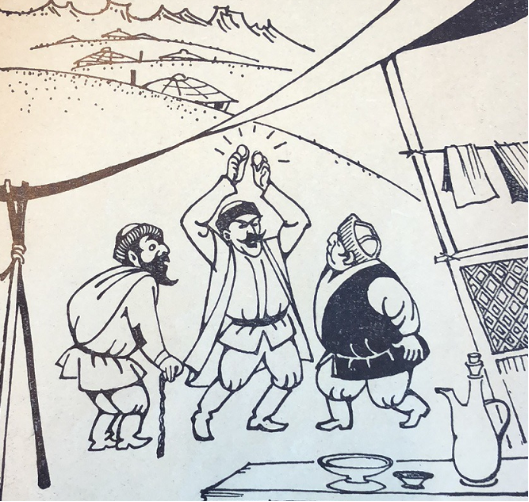 窮漢說:“我上他飯館里來是真的,坐在門檻上吃馕也是真的,我來的時候本想吃點菜,但他這兒的菜太貴了,我的錢不夠,想等點剩菜,哪知道這個不知道可憐窮人的老爺,什么也沒給我,我只好吃了自己的馕。您想想就這樣他應該找我要錢嗎?”霍加納斯爾點了點頭說:“你說得也對,可是你有錢嗎?”窮漢說:“我只有兩三個小錢。”胖掌柜的在旁邊跟著就說:“少點兒也行,給我吧!要不你就甭想走!”說著就伸著手要錢。霍加納斯爾說:“掌柜的,你先別著急,你先到那邊等等再來。”