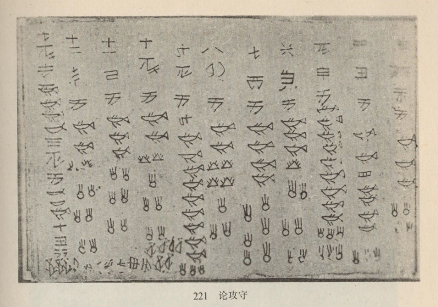 水書抄本。寫于清嘉慶年間,共20頁,長18厘米,寬27厘米。以竹簽作筆蘸墨書寫。內(nèi)容述戰(zhàn)爭陣法。中圖魚形表示守方,方框?yàn)橹笓]位置,三角形表示山頭陣地,圓圈加三畫表示進(jìn)攻之?dāng)硵⊥诵蜗蟆T姹本﹫D書館。