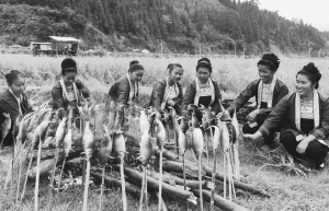 廣西三江侗族自治縣舉辦高山稻魚文化節,當地的程村、良口、富祿等鄉鎮以稻田抓魚、烤魚、風情表演等活動,吸引游客前往體驗原汁原味的侗鄉稻魚文化,樂享金秋豐收喜悅。近年來,該縣傾力推進“種稻養魚”特色產業,將傳統優勢轉化為資源優勢,并大力發展生態鄉村游,推銷高山生態健康食材,使群眾脫貧增收。圖為當地少數民族婦女在該縣富祿苗族鄉富祿村稻田內烤魚。