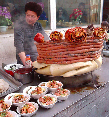 新疆盛產牛羊,是我國主要畜牧業基地之一。信仰伊斯蘭教的民族以食牛羊肉為主。牛羊肉風味小吃名類繁多自不待言,就是以羊的內臟作原料,也能烹制出鮮香異常的美味來。米腸子與面肺子便是其中的代表。