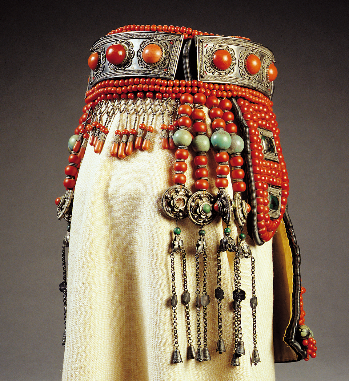 草原上,婦女們平時一般多罩頭巾。頭巾大約丈余長,顏色多種多樣。質料有布、麻、綢、絹等。姑娘們喜歡將頭巾纏在頭上,然后在右側挽一個小結,把頭巾的穗頭垂下來。已婚婦女們則用頭巾包住頭頂后,纏一圈,不留穗頭。在莊重的場合還要戴上繡有丹鳳朝陽、二龍戲珠等花紋圖案的帽子。帽頂上有紅色穗子和閃光明亮的帽頂寶石。傳說這種習俗始于成吉思汗時期。當初成吉思汗統一蒙古各部落之后,下令每個人都要罩頭巾,以表示頭顱上飄有旌旗之角,希冀民族強大之精神常在。從結婚、告別姑娘生活的那天起,婦女們便開始佩戴雍容華貴的盛裝首飾。而蒙古族的盛裝頭飾,以鄂爾多斯地區最為典型。這種頭飾漢譯為“頭戴”,主要由“連垂”和“發套”兩部分組成。不僅制作工藝精湛,而且多用數百顆珊瑚、數十條銀鏈、珍珠串和許多銀環、銀片以及瑪瑙、玉石等穿綴而成。裝扮起來可謂珠簾垂面、琳瑯滿目。一副頭戴一般都重達三四斤,有的可達十余斤。據說一副高檔頭戴,過去往往要用幾群好馬或數百峰好駝才能換取。