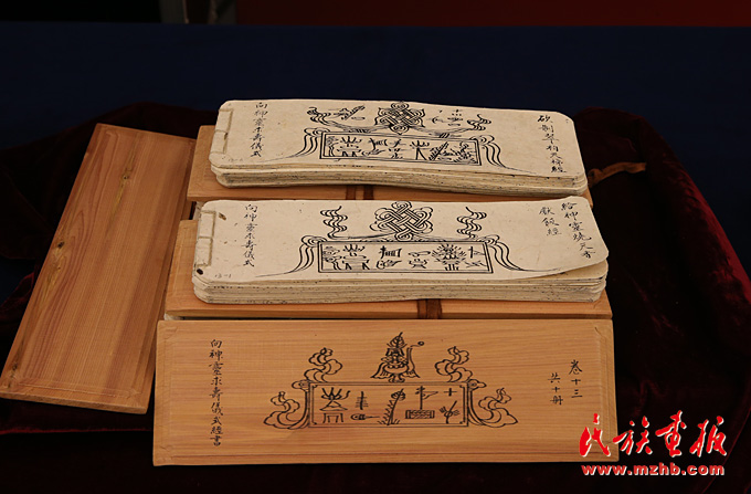 捐贈的部分東巴經手抄本,經書由納西族地區的35名東巴歷時29個月完成。經書的卷名、題名及經文提要漢文部分由納西族書法家許烈雄書寫,封面夾板的東巴文部分由納西族新一代東巴木琛書寫