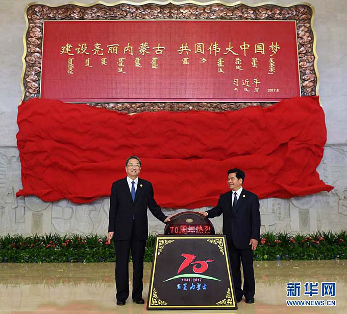 70年來,在黨中央高度重視、關(guān)心關(guān)懷下,內(nèi)蒙古各族人民在革命、建設(shè)和改革的各個歷史時期,創(chuàng)造了一個又一個人間奇跡,萬里草原發(fā)生了翻天覆地的歷史巨變。圖為8月7日,中共中央政治局常委、全國政協(xié)主席、中央代表團團長俞正聲率中央代表團出席向內(nèi)蒙古自治區(qū)贈送紀念品儀式,俞正聲和內(nèi)蒙古自治區(qū)黨委書記、人大常委會主任李紀恒一同為習近平總書記題詞賀匾揭幕(新華網(wǎng))