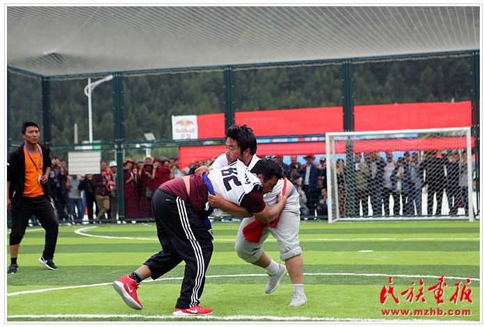 甘肅省甘南藏族自治州的迭部縣安多地區則巴邀請賽男子摔跤80公斤以上比賽(民族畫報記者 黃若天 攝影)