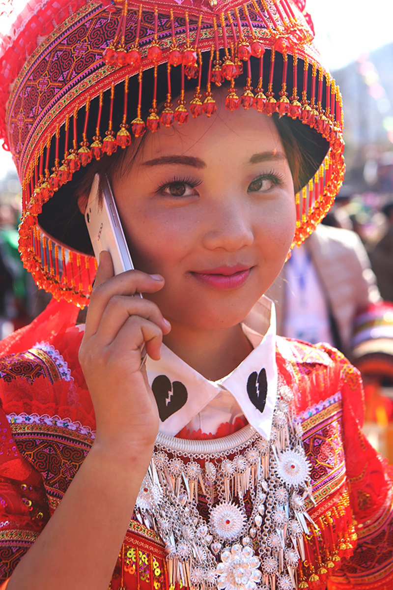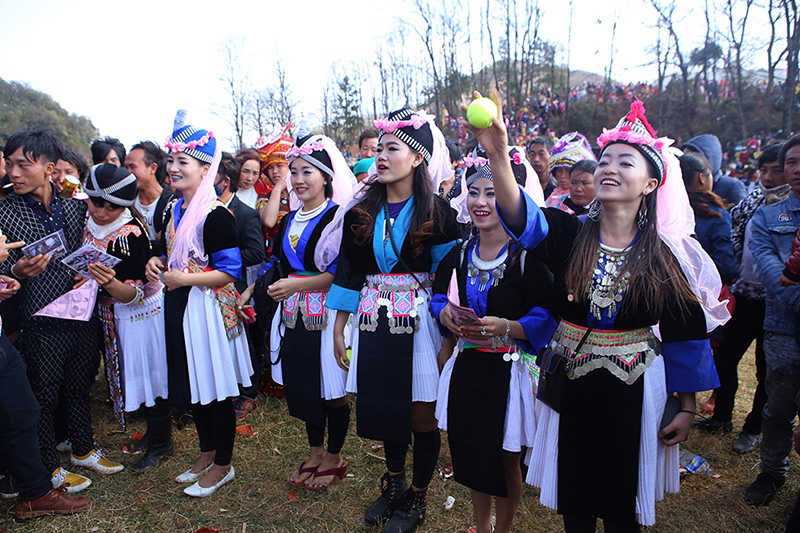 由于在歷史上經歷長時間、大范圍的遷徙,苗族文化形成了較強的環境適應能力和流動變遷特征。節日作為民族文化的凝集點,慶祝方式和形態也處于動態的演變和傳承之中。在大布紅的花山場,一個從老撾過來的苗族女子樂隊讓當地的苗族人感到好奇——說著同樣的西部苗語,卻穿著略顯不同的衣服。她們排成一行,教人們一來一往地扔繡包,一時間圍觀者無數。不消多久,女子樂隊手中的CD就在人群中銷售一空。