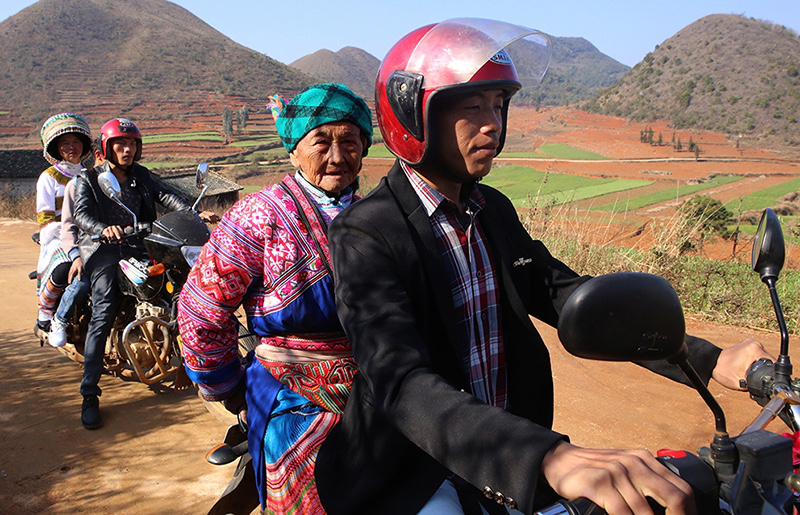 依布底一起去踩花山的人組成長長的摩托車隊,老阿婆腰桿筆挺盛裝坐在摩托車后座上。等他們來到大布紅村的花山場時,那里早已人山人海,空地上山坡上也擠滿了衣著鮮艷的人群。