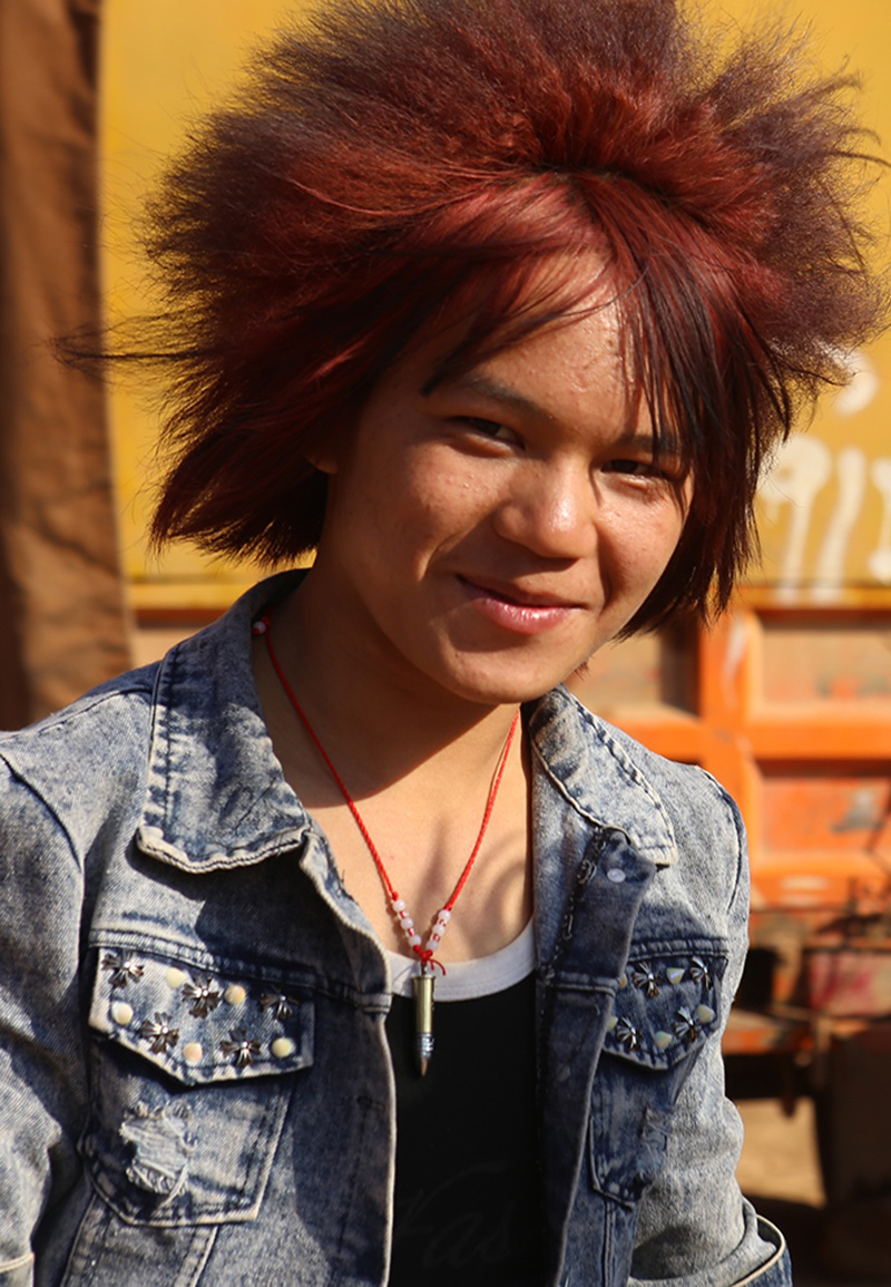 與女性不一樣,這里的男性不講究穿苗服。大多數苗族年輕男子如今都在城里打工,他們更愿意展現自己個性時髦的一面,印有外文字母的休閑衣服受到格外的歡迎。新潮的西服皮鞋,嬉皮的休閑牛仔,紋身,墨鏡,耳釘,項鏈……我發現幾乎所有的年輕男子都會在自己的頭發上做點文章,而今年的潮流似乎偏向夸張的美感。