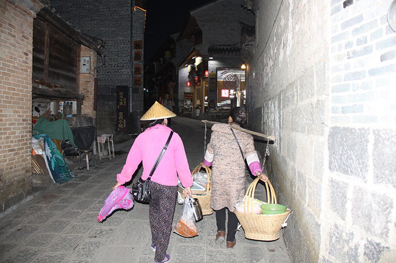 晚上7點多鐘,一群在小河里撲騰了一天的鴨子排著隊憨態可掬地回到寸家灣巷口,忙碌一天的人們也開始回家。我正擔心晚上約定的采訪找不到地方,卻在圖書館旁邊的小巷里碰到了收工回家的姜聰留。她今天的松花糕賣了一板半,收入100多元。同行的一個姐妹幫她挑著擔子,姜聰留自己提著袋子和板凳,一路無語。臨近家門的路口,姜聰留從姐妹肩上接過擔子,眼神默契相視后,各自回家——這就是她們的生活。晚飯姜聰留到丈夫的大哥家吃土鍋子,兩家的院子只隔一墻,我也跟著進了大哥江宗良的家門。