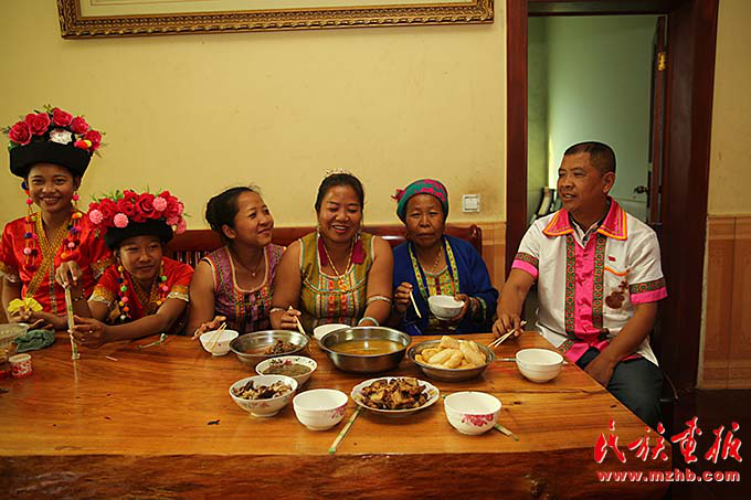 在曼夕村,民族傳統(tǒng)節(jié)日已成為不同民族間聯(lián)絡(luò)增進感情的最佳時機。曼夕村村主任車達告訴記者,他自己是哈尼族,村里還有漢、布朗、哈尼等民族。40多年前,為了種植橡膠樹布朗族與彝族遷徙過來生活在一起,幾十年來,兩個民族相互尊重對方的生活習慣,過年過節(jié)相互走動拜訪,互相通婚成為一家人。晚飯時,記者在曼夕村村支書巖坎硝家里聚餐時看到車達帶著幾個哈尼族婦女盛裝出席,宴會上人們相互祝賀,唱敬酒歌。哈尼族婦女圖處告訴記者,哈尼族過傳統(tǒng)節(jié)日,布朗族村民要來慶賀,布朗族過節(jié),哈尼族人也去祝福,幾十年來一直如此。