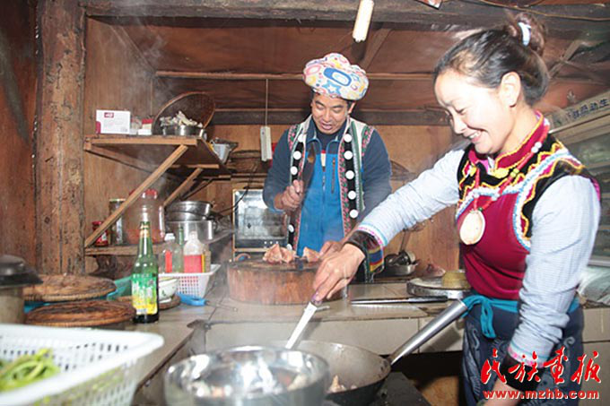 早上,老姆登村73歲的怒族老人斯普早早起來招呼兒子郁伍林、兒媳魯春花:“春節快放假了,客棧的生意會忙得不可開交,趁著現在客人不多,家里人先吃一頓團圓飯吧。”斯普老伴早年過世,7個兒女中老五郁伍林在身邊照顧她。“過去在春節才能吃上一頓好飯菜,也要準備很長時間,現在每天都有好吃的,天天在過年,多虧了黨的好政策。”說起今天的幸福生活,生在舊社會的斯普感慨萬千。