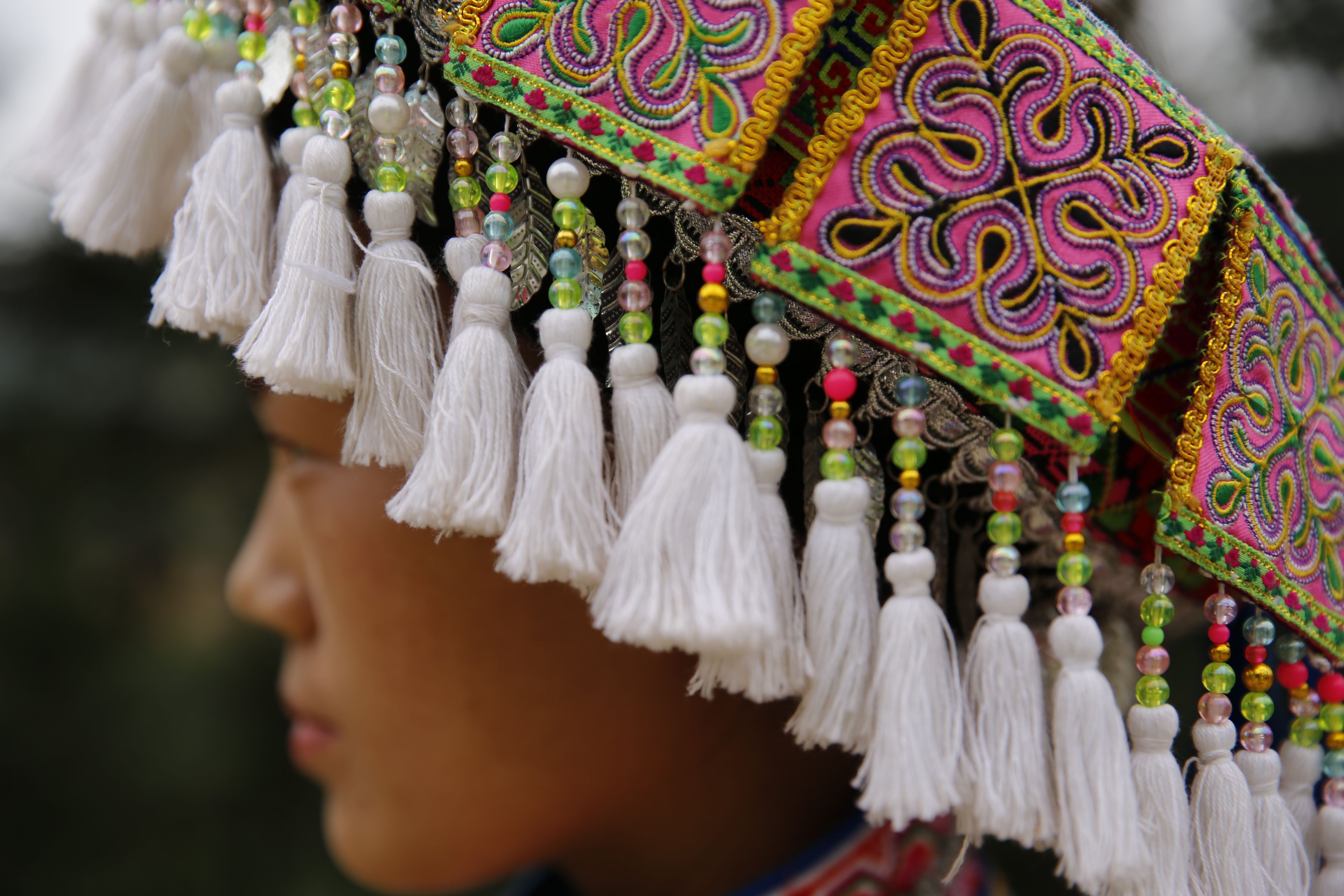 苗族女子服飾花帽-側面繡花及裝飾1