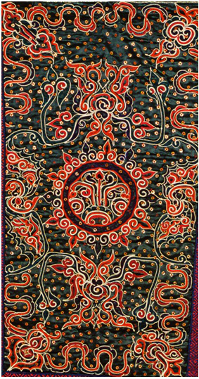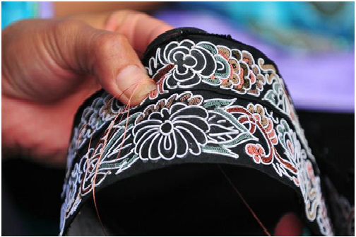 第四步是刺繡,包括三個環節,即固定框架圖案、填芯和鑲邊。固定框架圖案,即用一根大針將馬尾線穿好,再用另一根稍小的針穿上同色絲線,然后一邊用馬尾線在布面上鑲成各種圖案,一邊用穿有絲線的小針將圖案固定在布面上。填芯,即用各色絲線將固定好的圖案空隙部分填滿。鑲邊,即用橙色和黑綠色絲線在四周挑繡成鑲邊圖案。
