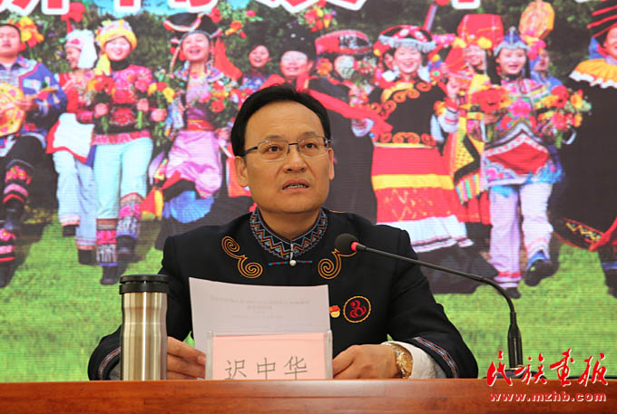楚雄州委副書記、楚雄州人民政府州長遲中華介紹楚雄彝族自治州基本情況和自治州成立六十年來經濟社會發展的輝煌成就等情況