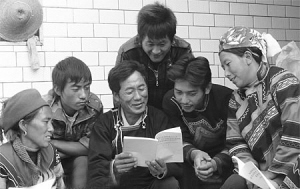 四川省西昌市大箐鄉民主村彝族群眾學習彝文版《十七大報告》。 資料圖片