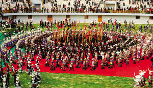 貴州省黔東南苗族侗族自治州雷山縣作為中國苗族歷史上大遷徙的集結地和中國苗族文化中心,以厚重獨特的文化,包括苗年在內的11項文化遺產登上了中國非物質文化遺產的殿堂。苗年是苗族一年中最重要的祭祀傳統節日,是苗家人的一大盛事,每年都有來自全國乃至全世界的游客到雷山參加苗年活動。圖為紅火熱鬧的苗年歡慶場面。