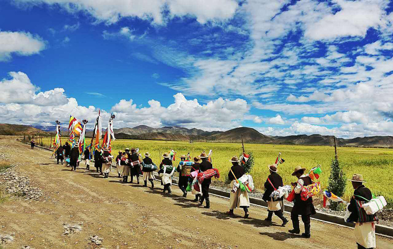 節日的第一天早晨,當陽光撒滿金黃麥田的時候,農民們手持麥穗圍著農田轉圈游行,最前邊是由喇嘛和老年農民組成的儀仗隊,高舉佛像,背著經書,吹著佛號,感謝上天給人們帶來了風調雨順的好年成。轉完麥田以后,照例要在廣場上舉行群眾性文娛體育活動,其中有藏戲、歌舞、跑馬、射箭、拔河等,十分熱鬧。這天,家家戶戶都要準備充足的酒食,穿上最漂亮的衣服,或者在廣場四周的草場上野餐,或者在村子里邀集親朋好友宴飲。青年男女則喜歡在晚上圍著篝火跳舞,對唱情歌,直到深夜。