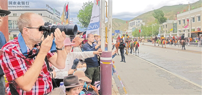 外國游客拍攝街頭巡游的馬術方隊