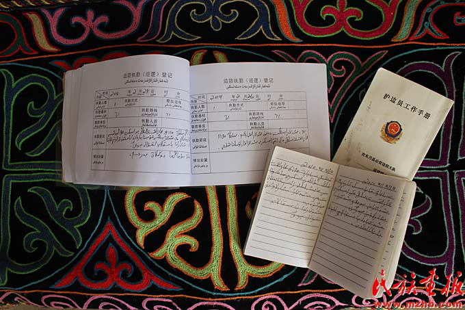 馬合沙提 ·斯拉木每天都要記錄邊防執勤(巡邏)情況(趙利 攝影)