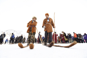 在今年的慶祝活動上,當地好客的各族群眾身著傳統服飾,載歌載舞。手拿單杖、腳踏毛皮滑雪板的小伙兒,與腳踩現代雪板、手持雙杖的小伙兒并排站立,分外搶眼。