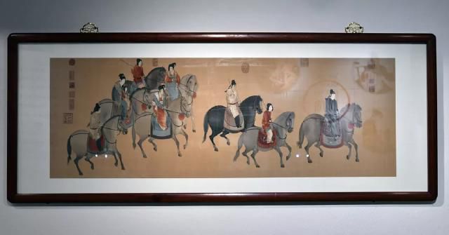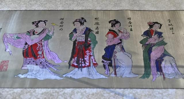 取材于唐代畫家張萱的畫作《虢國夫人游春圖》和《簪花仕女圖》,作品采用橫織豎裱的方式呈現。