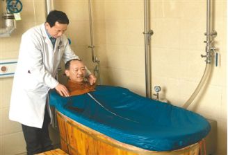 西藏自治區藏醫院藏醫藥浴中心負責人次仁桑珠,在為患者做藏醫藥浴治療。