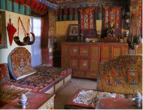 柱頭裝飾包括柱頭、斗拱、大梁等部位的雕刻、彩繪。在藏族居室中柱子、橫梁位置顯要,因此對這部分的裝飾在整個(gè)室內(nèi)裝飾中至關(guān)重要。無論高雅精致的殿堂還是普通百姓的民居都充分認(rèn)識到這一點(diǎn),進(jìn)行合理裝點(diǎn)以求莊嚴(yán)、堂皇、舒適的效果。就拿寺廟集會大堂的柱頭、橫梁來講,裝飾十分考究。天花板下的椽子木頂端整整齊齊地、略有間隔地排列在大梁上方,用彩繪的辦法進(jìn)行裝點(diǎn)。椽子至大梁之間夾著兩道橫杠,其上道用累卷疊函凹凸方格木雕處理,下道橫杠用蓮花瓣依次排列的雕刻或彩繪完成,這種裝飾是約定俗成的,上下圖案不能隨意調(diào)換。橫梁上的裝飾大多采用填充連接長方格來進(jìn)行。橫梁表面劃分大小等同的長方格,這些連接的長方格內(nèi)或填寫梵文經(jīng)文,或繪各種花卉,用這樣的手段裝飾大梁。柱頭與橫梁之間是斗拱,藏族建筑對斗拱的裝飾非常講究。斗拱分兩層,上為長弓,下為短弓。斗拱長短兩弓本身形狀要精心雕摟,其表面也用雕刻著色的辦法加以渲染,以求良好的裝飾效果。斗拱裝飾有簡有繁,最簡單的斗拱形狀為梯形,這種不加任何雕飾的斗拱多見于底層的儲存室內(nèi)。而寺廟建筑大堂、佛堂之類重要殿堂內(nèi)的斗拱是經(jīng)過精心雕鏤的藝術(shù)品,尤其是斗拱長弓形狀千姿百態(tài),通常見得較多的有祥云狀,此外還有各種花瓣?duì)睿溲b飾效果相當(dāng)強(qiáng)。除了斗拱形狀的雕刻外,表面上雕刻各種圖案獲得錦上添花的效果。長弓中心雕刻佛像,兩邊及邊緣雕刻祥云、花卉、整個(gè)斗拱表面顯得飽滿、大方。柱子、柱頭也是裝點(diǎn)的一個(gè)良好的空間,柱子形狀有圓有方,也有部分多角柱。柱子最上面的部位或雕或繪花瓣,在下是長城箭垛式圖案,這兩樣圖案的下面是短簾垂鈴式圖案,所有柱頭裝飾圖案基本上按此模式制作。除了雕鏤精細(xì)的寺廟大殿柱頭大梁裝飾以外,大量的柱頭裝飾見于藏族民居室內(nèi)。民居室內(nèi)柱頭大梁裝飾的基本走向、風(fēng)格與寺廟裝飾設(shè)有大的區(qū)別,彩繪圖案、顏色運(yùn)用、布局結(jié)構(gòu)除了個(gè)別外,與寺廟裝飾相同,只是民居室內(nèi)柱頭大梁裝飾多半是彩繪,幾乎見不到雕刻,這是經(jīng)濟(jì)條件所限呢還是等級待遇不同不得而知。兩者除了裝飾上的簡繁區(qū)分之外其余部分很好地保持了藏民族建筑風(fēng)格的一同性。