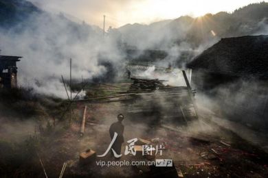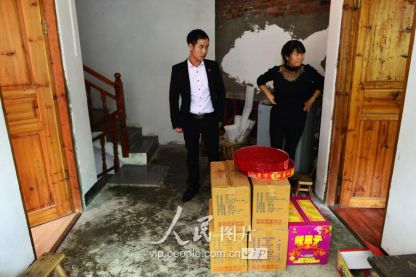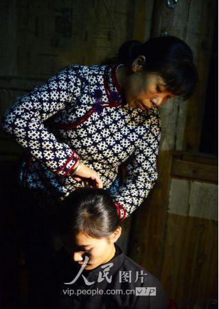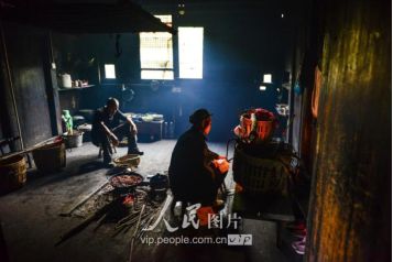 一般要到快過春節的時候,男方家才專門請人去接女方來洗糯米、打糍粑,新娘方能在夫家住上一夜;在來年農忙時節,又接女方來幫忙,夜里仍不能在男方家留宿,幫完忙當晚即回去,只有待到女方有身孕后,新娘才到夫家長住。圖為11月16日夜,新娘潘芝銀家為準備婚禮,燈火徹夜長明。