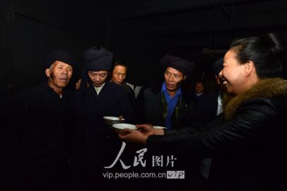 11月17日凌晨,新娘家的親戚在“發親”前與新郎家派來的“關親客”對歌敬酒。
