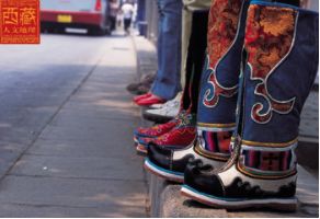 西藏高原地域遼闊,每個地區都有屬于自己的鞋子。藏族男女鞋,外觀雖然很像舞臺上古裝戲里穿的靴子,但用牛皮做底,底高二寸,腰高至小腿之上,鞋面用紅綠相間的毛呢裝飾,鞋腰也有線條、花紋,鞋幫用各色絲線或各色皮革、氆氌、金絲緞制成。人們能從一個人所穿的鞋子判斷出一個人的職業和社會階層。