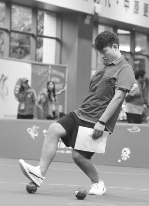 在分組循環賽女子單蹴中,河北隊員趙佳美遇到了強勁對手——福建隊男女混合雙蹴一等獎得主鐘金雪。趙佳美發揮得不錯,雙方比分始終咬得很死。鐘金雪起腳擊球干凈利落,在比分上形成壓制。