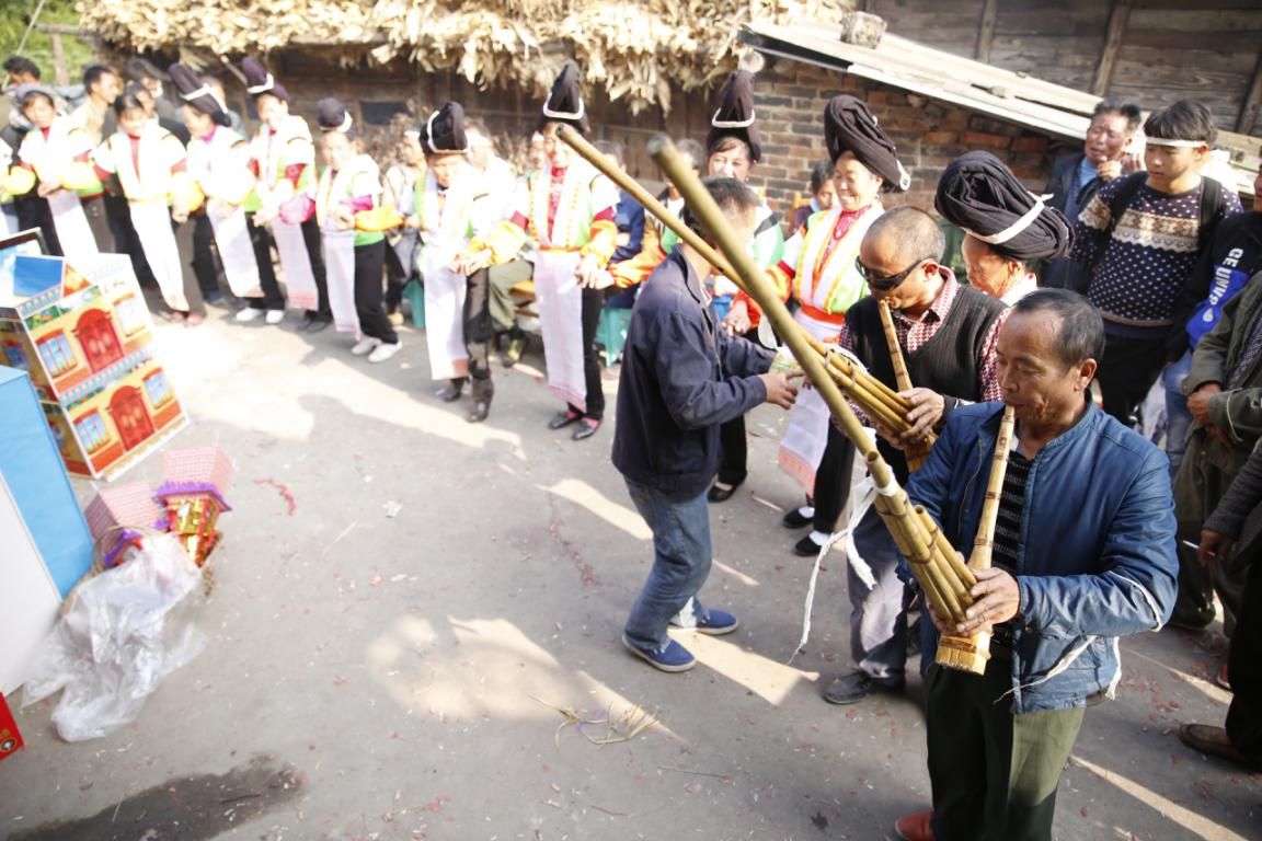 制作:蘆笙管用當地稱蘆笙竹的竹子制作而成,管的兩端直通(有的地區蘆笙是上通下不通),按孔為方形(有的地區為圓形),簧片制作與其他地區蘆笙一樣;共六組合,用花果樹皮作兩道箍。