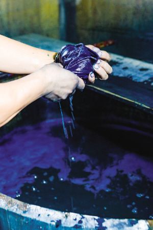 藍(lán)靛染布是一項(xiàng)古老的工藝,是白褲瑤服飾文化的重要組成部分。白褲瑤婦女用藍(lán)靛草來提取染布用的靛泥,隨時(shí)染藍(lán)、青棉線和青布。縫制衣物的白棉布用藍(lán)靛這種天然染料染色,其色澤與一般的機(jī)織布印染有所不同。2018年8月拍攝。