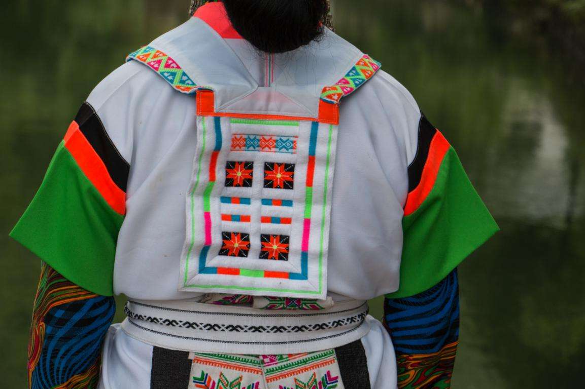 改毛村苗族女性服飾顏色較為亮麗,樣式較為花哨,女子頭戴黑色百褶帽,百褶帽形似一只船,在其尾部還裝飾有用絲巾制作而成的花朵作為裝飾。上身則多以黃綠色打底的對襟短衣為主,對襟處繡有花紋圖案作為描邊。女子身后大多穿戴背牌,背牌做工極為精細,刺繡圖案豐富,圖案多以幾何和花草為主。女性服飾下裳主要分為三個部分,底部為黑色打底長褲,中層為黑色打底的百褶裙,上層則為黑色打底的圍腰。圍腰底部繡有花紋圖案裝飾,圖案內容多以花草為主。腰部系有腰帶,腰帶上刺有花紋圖案且顏色較為鮮艷。女性服飾身后還垂有兩條絲帶,絲帶上繡有大面積的花紋圖案作為裝飾。