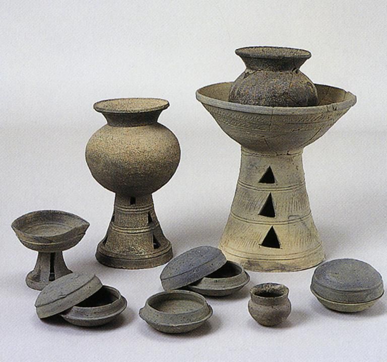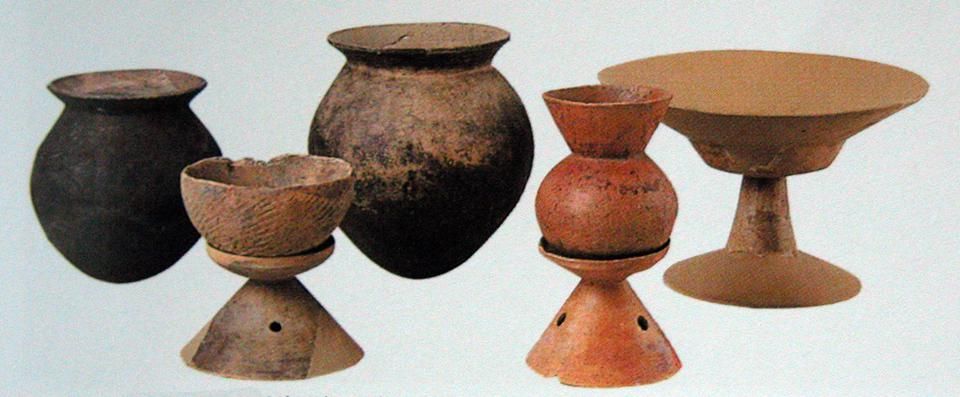 彌生時代的名稱,源自1884年東京市本鄉彌生町“彌生陶器”的發現。彌生陶器與繩紋陶器截然不同,為素面,灰色。日本人認為彌生陶器是“渡來人”制造的。“渡來人”是中國大陸通過朝鮮半島而來,他們帶來了陶器的制作技術。彌生陶器為深釜器,以甕形器、缽形器、高腳杯(豆形器)為主(圖五)。