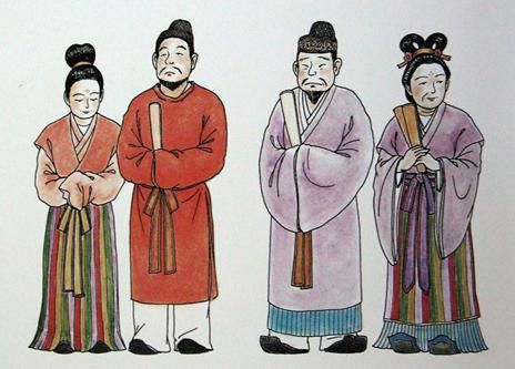 平城京內人們所穿的衣服,和唐代服裝也一樣,男子為圓領袍衫,女子為間色裙。唐代因布匹幅面較窄,一條裙子用不同顏色布匹拼接而成,顧名間色裙,一般用六幅制成。腳穿木屐(圖二十三)。