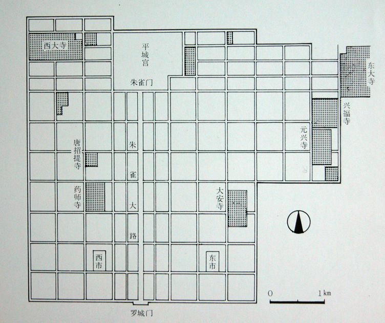 平城京在規模上繼承了藤原京,面積大致相同,東西約5.9km、南北約4.8km,其形制主要模仿唐長安城。全城平而呈長方形,宮城在北部中央。南面正中設象征性的都城正門——羅城門。羅城門與宮城的朱雀門相對,朱雀大路縱貫南北,全長約3.8km,寬72m。而此朱雀大路正好將全城分為東西兩部分,分別稱左京和右京。京城內有里坊與商市(即東市和西市)。這些設置和街道的名稱都和唐長安一模一樣,但總體面積僅為唐長安城的四分之一(圖二十一)。