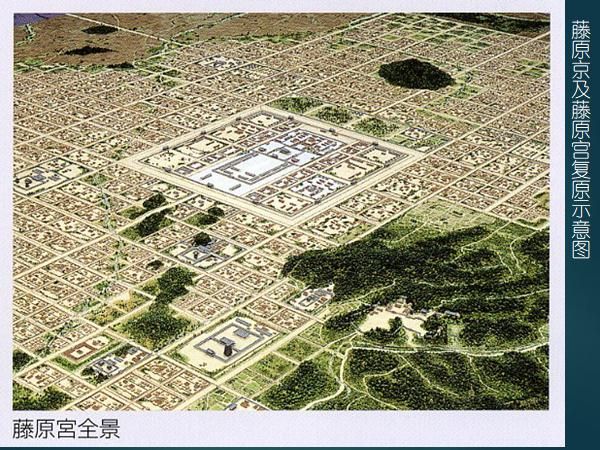 飛鳥-奈良時代對作為中央集權國家的象征的都城建設,極其重視。藤原京是持統、元明、元正三代天皇延用了16年的都城遺址,這個遺址經過幾十年的考古發掘,已經探明了藤原京和藤原宮的范圍及布局(圖二十)。京城東西及南北各長5.3km,平面近正方形,宮城在其中央,這點與唐長安城不同。有學者認為,藤原京是以《周禮》規定的理想化都城建制為依據所筑成的。