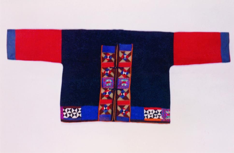 剪花衣又為“縑花衣”,是清末明初阿昌族已婚婦女的一種上衣,主要流行于云南省德宏傣族景頗族自治州梁河縣阿昌族地區。這種衣服的特點是:毛質地,多為深色,長袖圓領對襟,釘圓銅扣,前襟和衣服四周均用各種顏色的方形或三角形布片鑲縫成幾何形圖案。中間還夾雜著刺繡花紋圖案。過去,姑娘出嫁與新郎拜堂和年老去世時都要穿著剪花衣服。前者表示夫妻白頭偕老,生死不離;后者被認為到陰間可以和親人相會團聚。久而久之,穿剪花衣成為阿昌族的特定風俗。