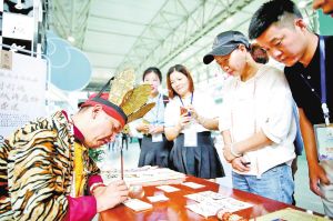 在云南文博會上,來自麗江的納西族東巴文化傳承人現場展示東巴文字的書寫方法。 張彤攝