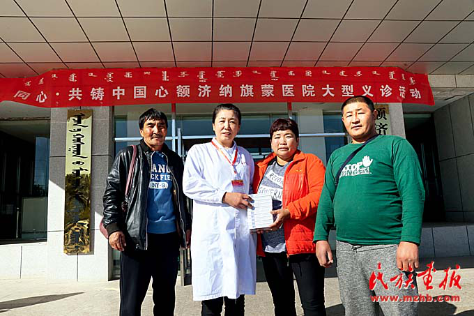 在額濟(jì)納旗蒙醫(yī)醫(yī)院開展的義診活動上,專家們向蒙古國患者贈藥。